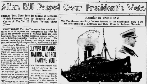 Vào ngày này năm 1917, với đa số hơn hai phần ba, Quốc hội Mỹ đã bác bỏ quyết định phủ quyết mà Tổng thống Woodrow Wilson đưa ra vào tuần trước đó và chính thức thông qua Đạo luật Nhập cư (Immigration Act). Đạo luật này yêu cầu người nhập cư thực hiện bài kiểm tra khả năng đọc viết và cấm lao động người châu Á, ngoại trừ những người đến từ các quốc gia có hiệp ước hoặc thỏa thuận đặc biệt với Mỹ, chẳng hạn như Philippines.